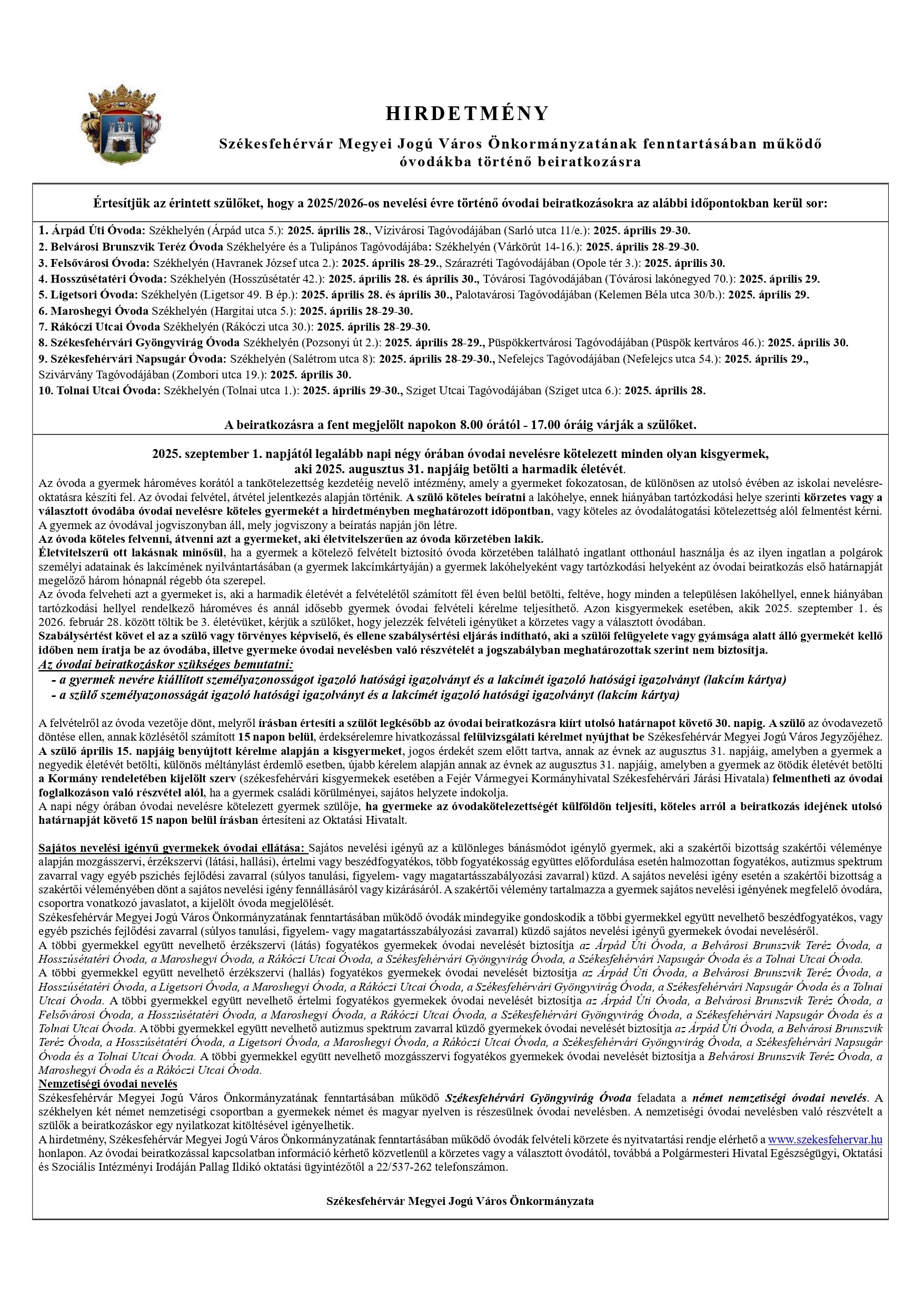 Értesítjük az érintett szülőket, hogy a 2025/2026-os nevelési évre történő óvodai beiratkozásokra az alábbi időpontokban kerül sor