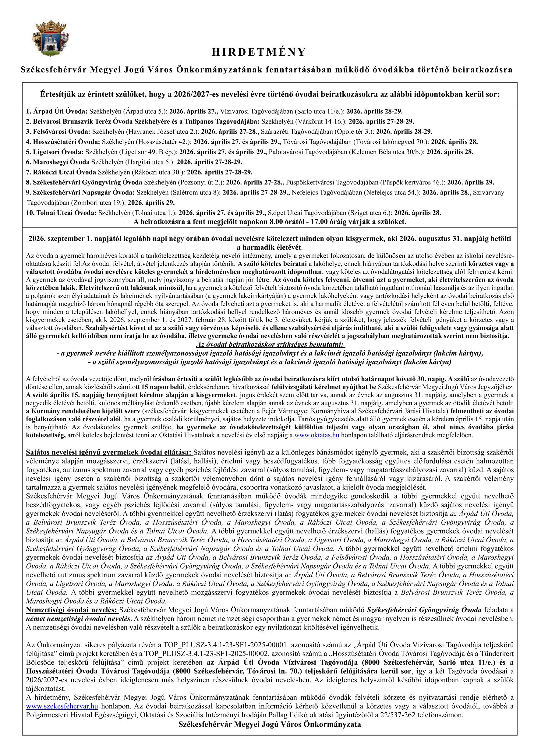 Értesítjük az érintett szülőket, hogy a 2026/2027-es nevelési évre történő óvodai beiratkozásokra az alábbi időpontokban kerül sor